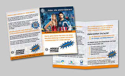 Ein kompakter 4-seitiger Flyer informiert umfangreich über die Ausbildungsberufe, die Eingangsvoraussetzungen und die Unternehmenskultur bei Bürkle + Schöck.